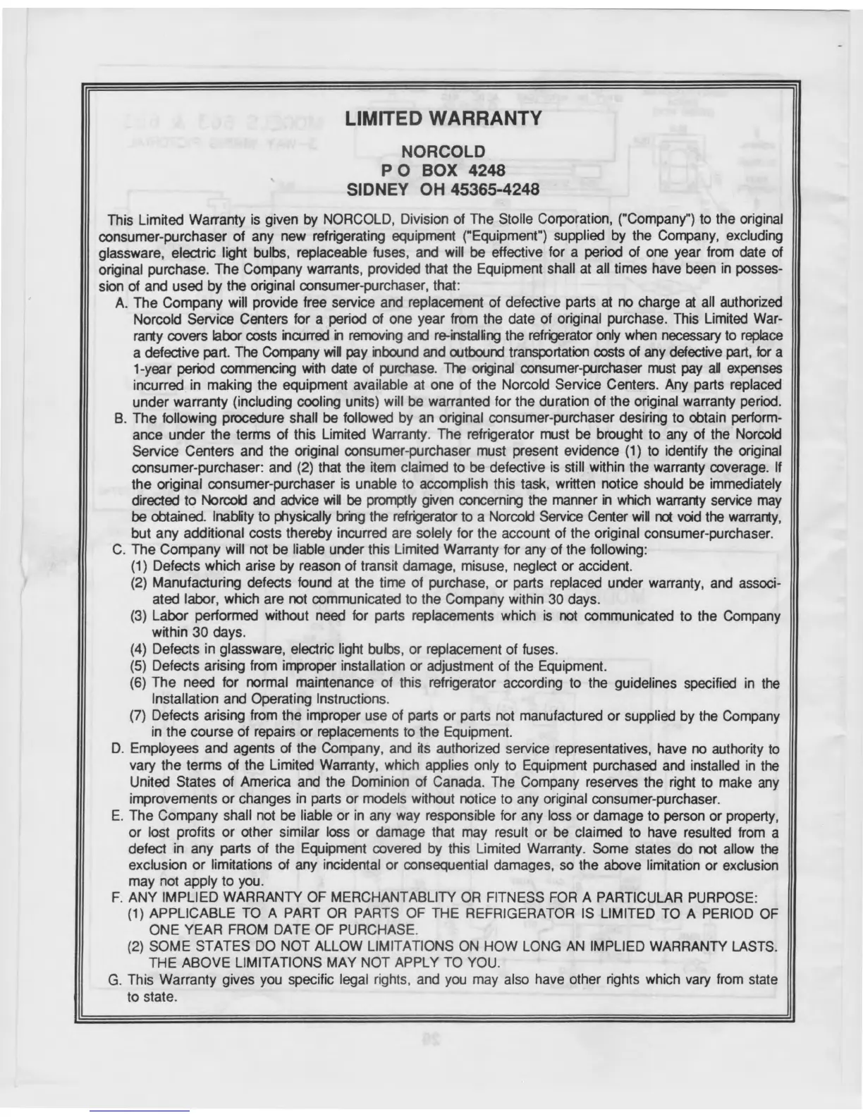 ance under the terms of this Limited Warranty. The refrigerator must be brought to any of the Norcold