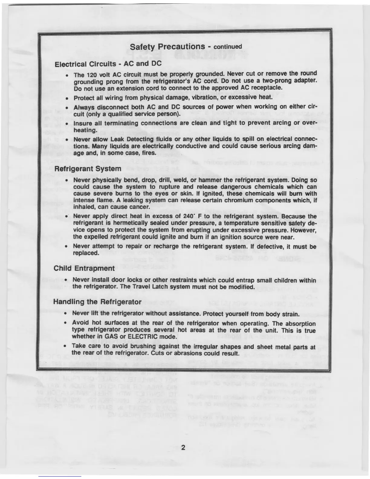 Norcold 683 - Electrical Circuits - AC and DC; Refrigerant System; Child Entrapment; Handling the Refrigerator