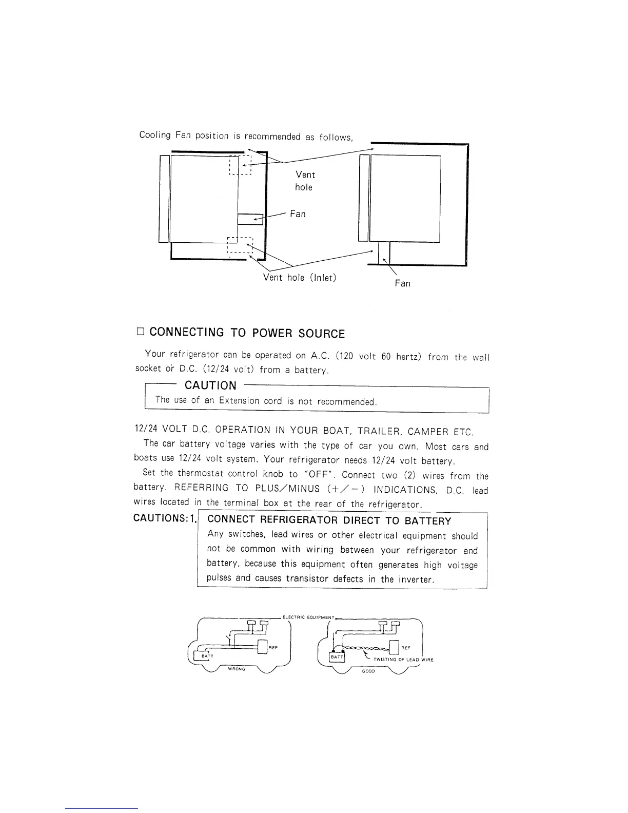 Norcold DE-451 - CONNECTING TO POWER SOURCE; DC OPERATION IN VEHICLES; DIRECT BATTERY CONNECTION CAUTIONS