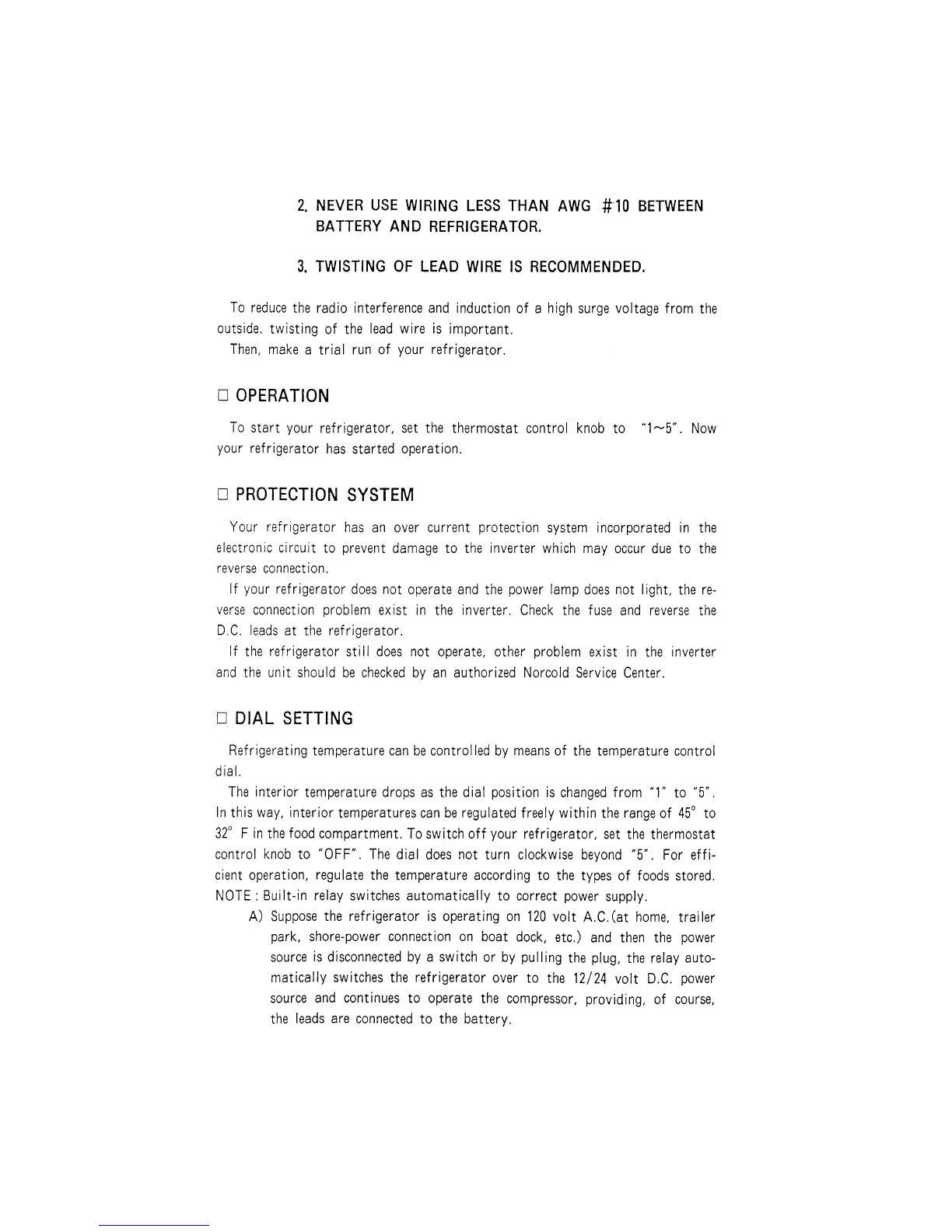 Norcold DE-451 - OPERATION; PROTECTION SYSTEM; DIAL SETTING