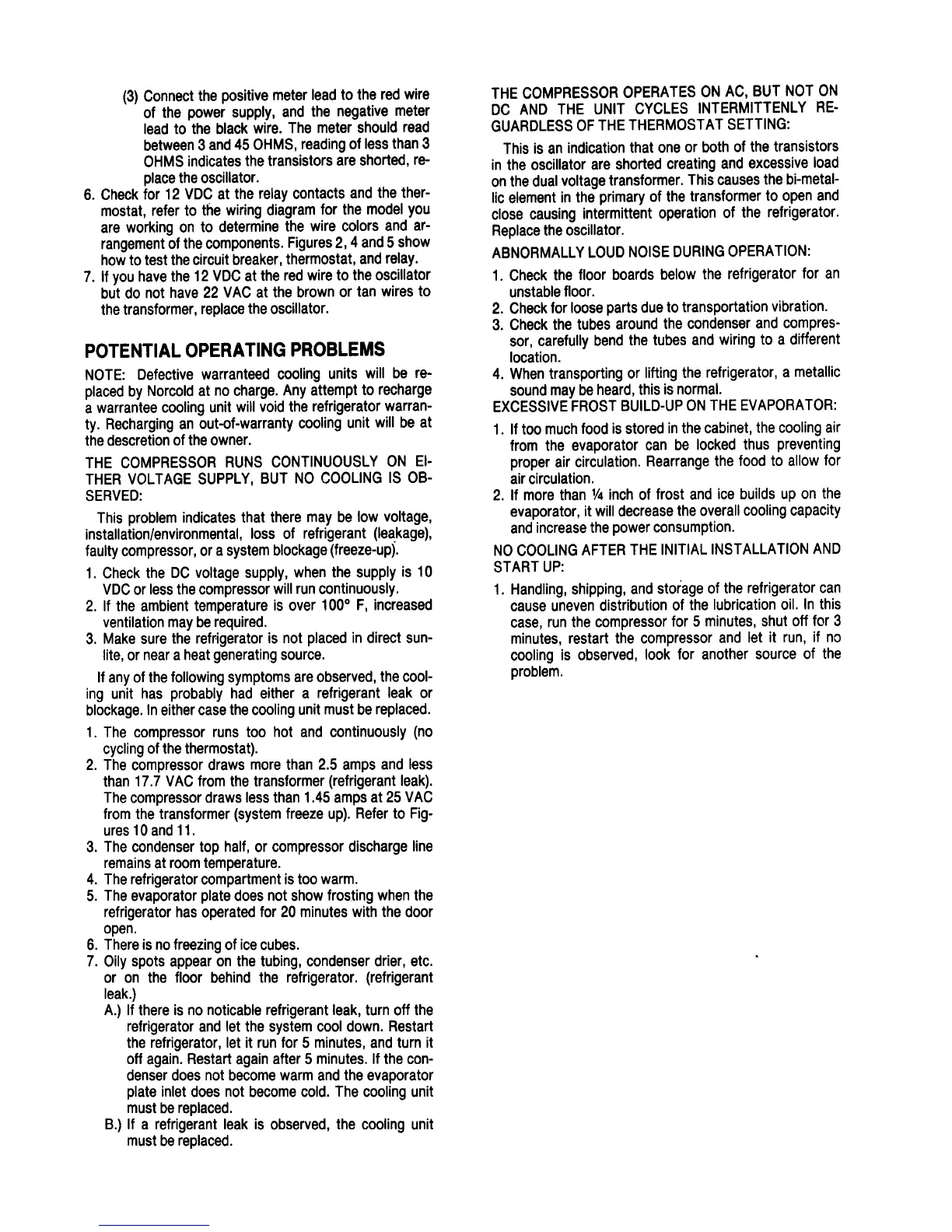 Norcold DE 728 - Potential Operating Problems; Continuous Compressor, No Cooling; Intermittent AC Operation; Abnormal Noise During Operation