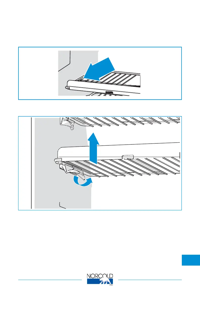 Turn the plastic clamp of the storage shelf upwards.