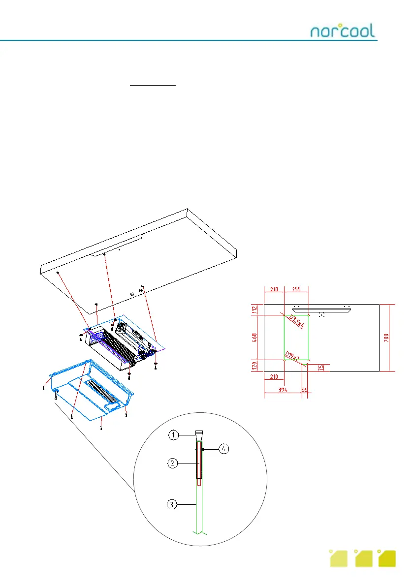 1. Montera förångardelen i taket med fyra skruvar 3,9x32 mm. För montering i skafferi, se skiss