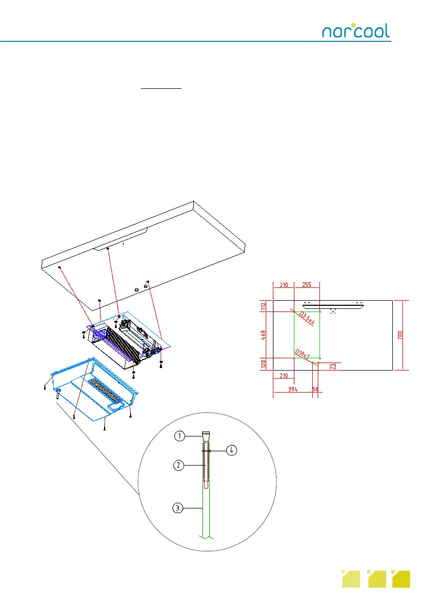 1. Monter fordamperdel i tak med 4 skruer 3,9x32mm. For montering i spiskammer, se skisse for