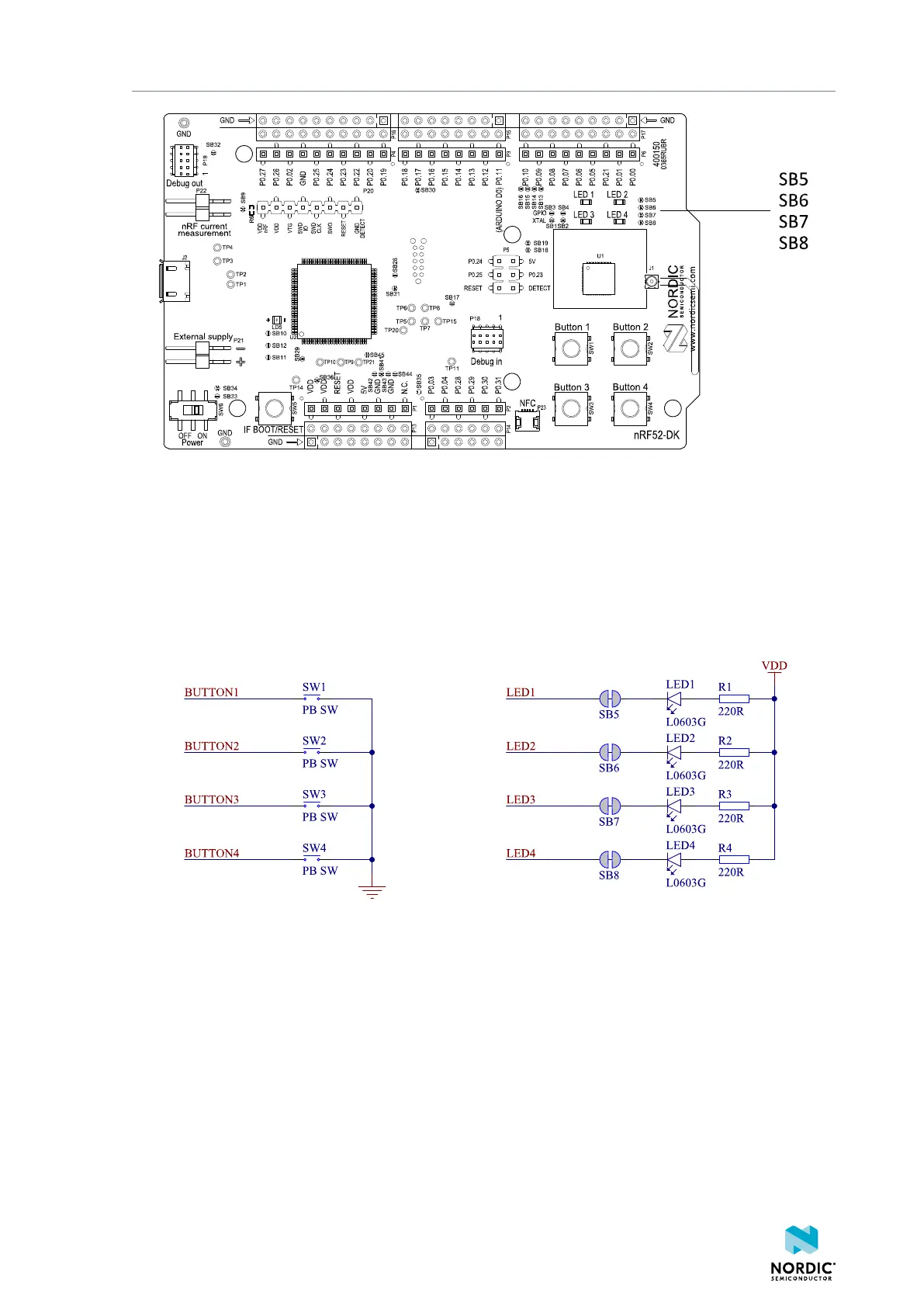 The buttons have no external pull-up resistor, so the P0.13—P0.16 pins must be configured as input with