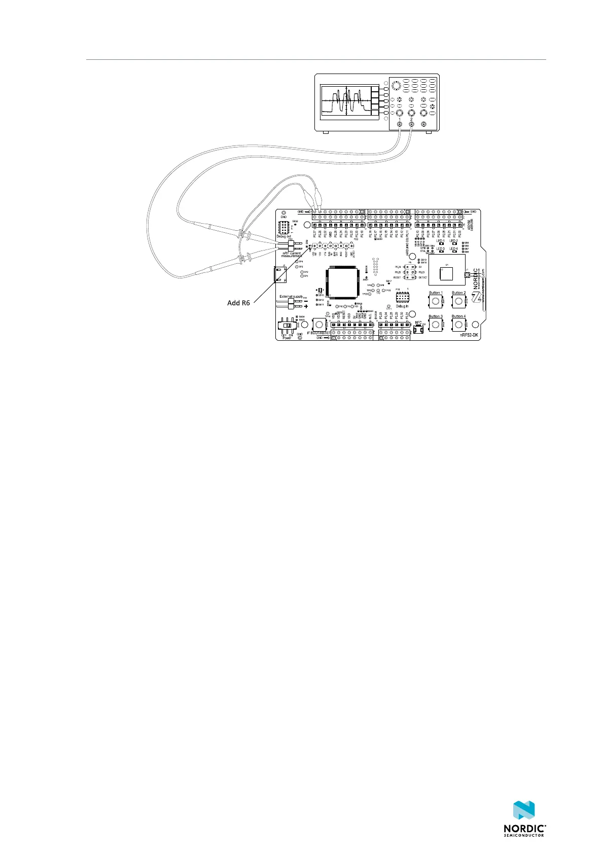 monitors the current in series with the nRF device.