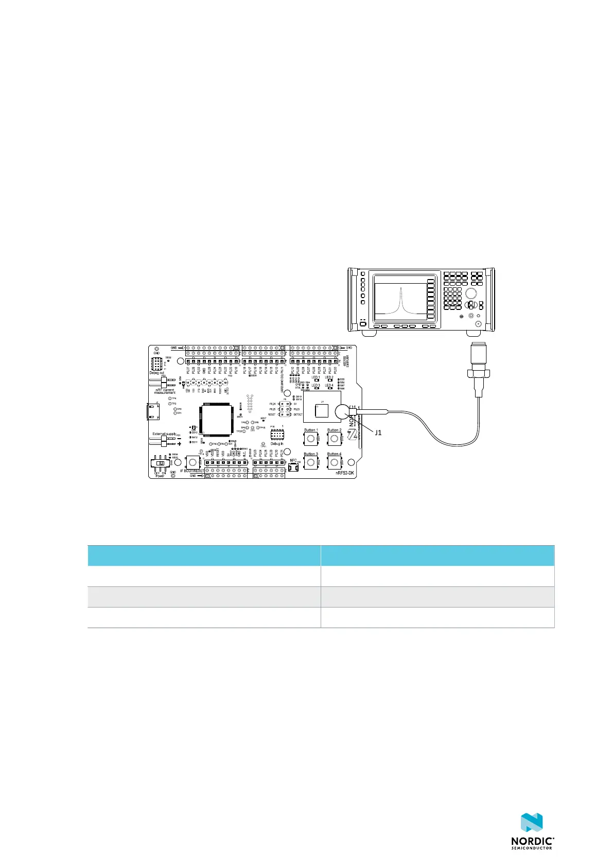 The nRF52 DK is equipped with a small coaxial connector (J1) for conducting measurements of the RF