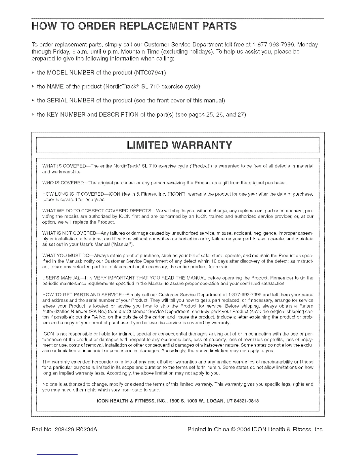 Part No, 208429 RO204A Printed in China @ 2004 iCON Health & Fitness, Inc,