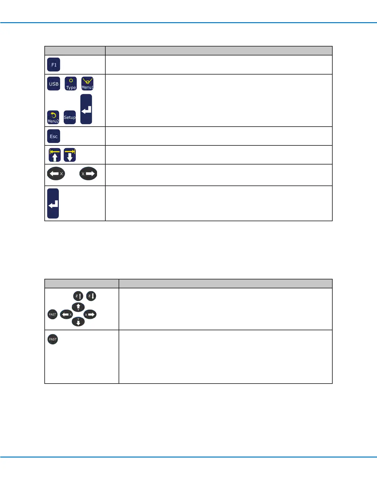 press steps the tip in the direction indicated on the key. Pressing and holding jogs
