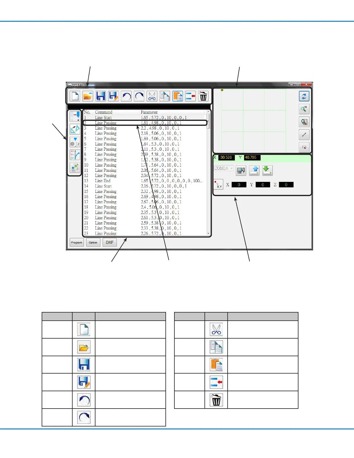 The Program screen editing icons are used to open program les and to manipulate commands within a program