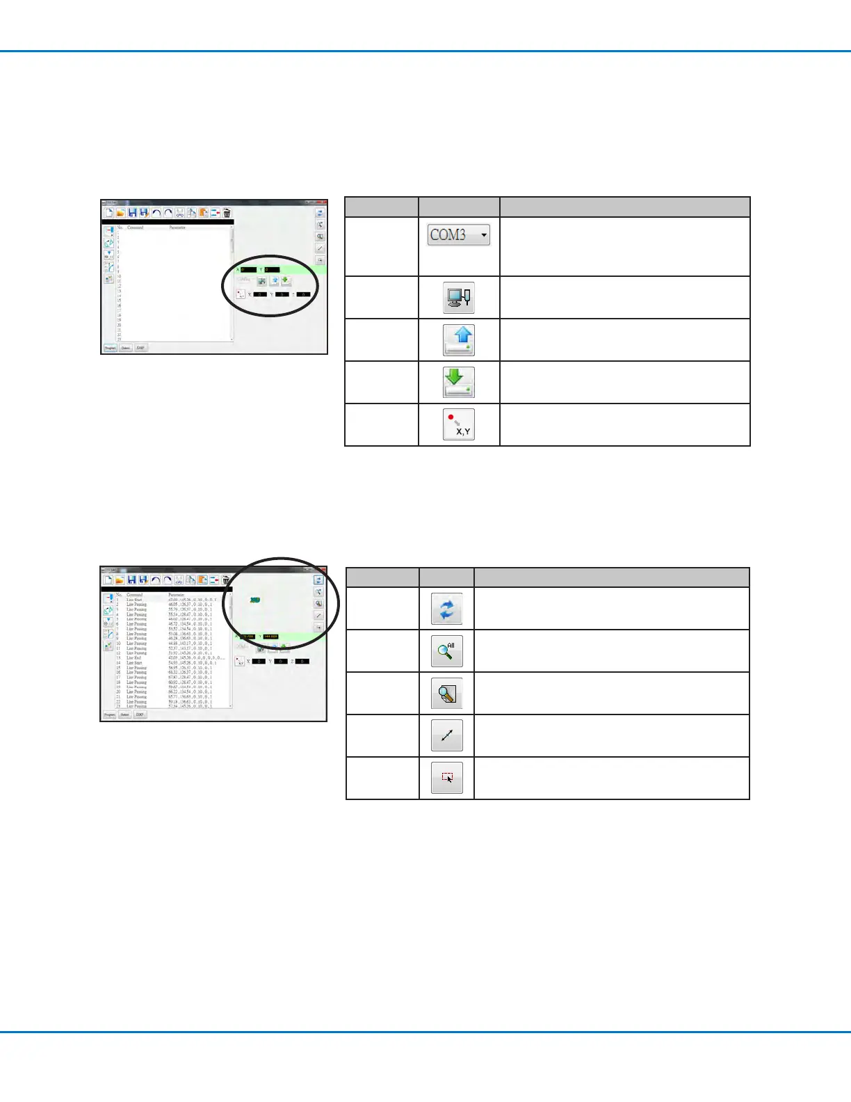 port selection drop-down menu and icons are used to connect or disconnect the system to a PC and to transfer