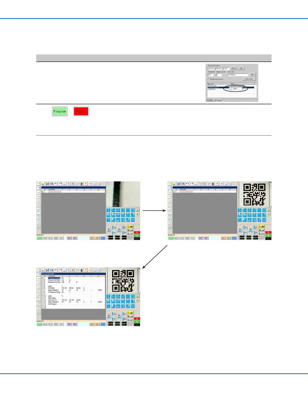 1. Clicking PROGRAM and then RUN to test the program. 2. The system moves to the QR code and scans it.