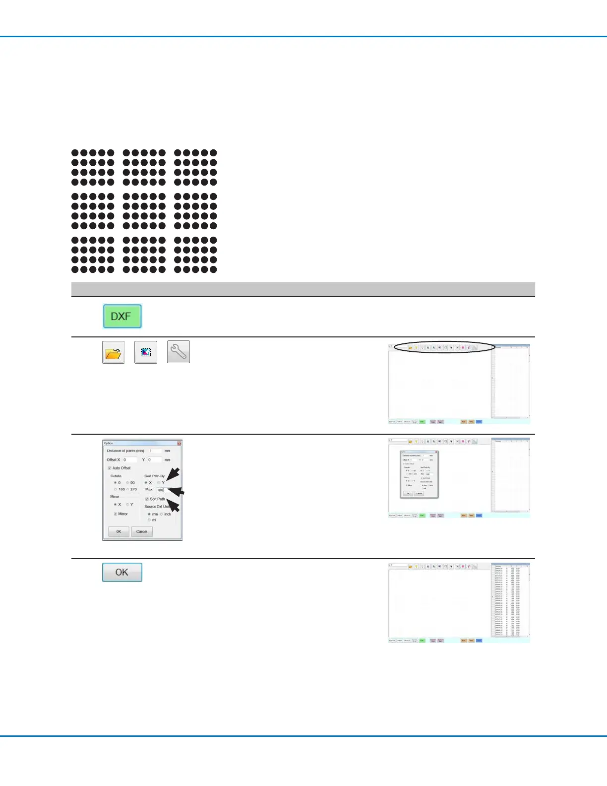 When importing a DXF file that includes an array of dots, you can use the Sort Path By option to choose how the dot