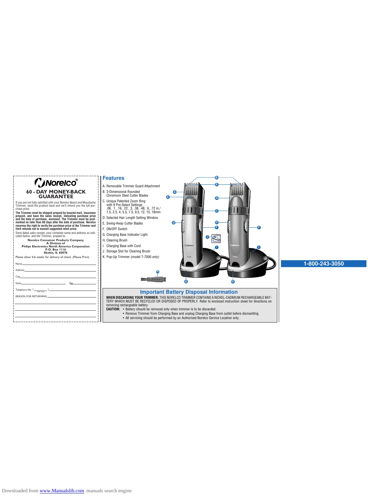 WHEN DISCARDING YOUR TRIMMER: THIS NORELCO TRIMMER CONTAINS A NICKEL-CADMIUM RECHARGEABLE BAT-