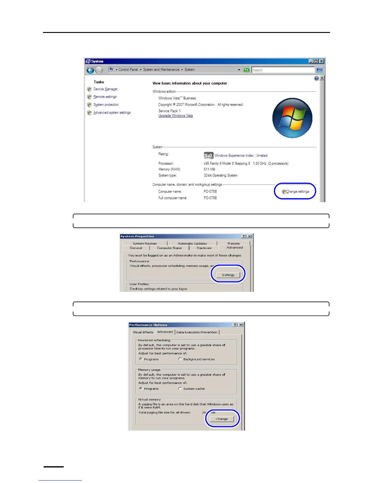 3. Click the Advanced tab, and click Change of Virtual memory.