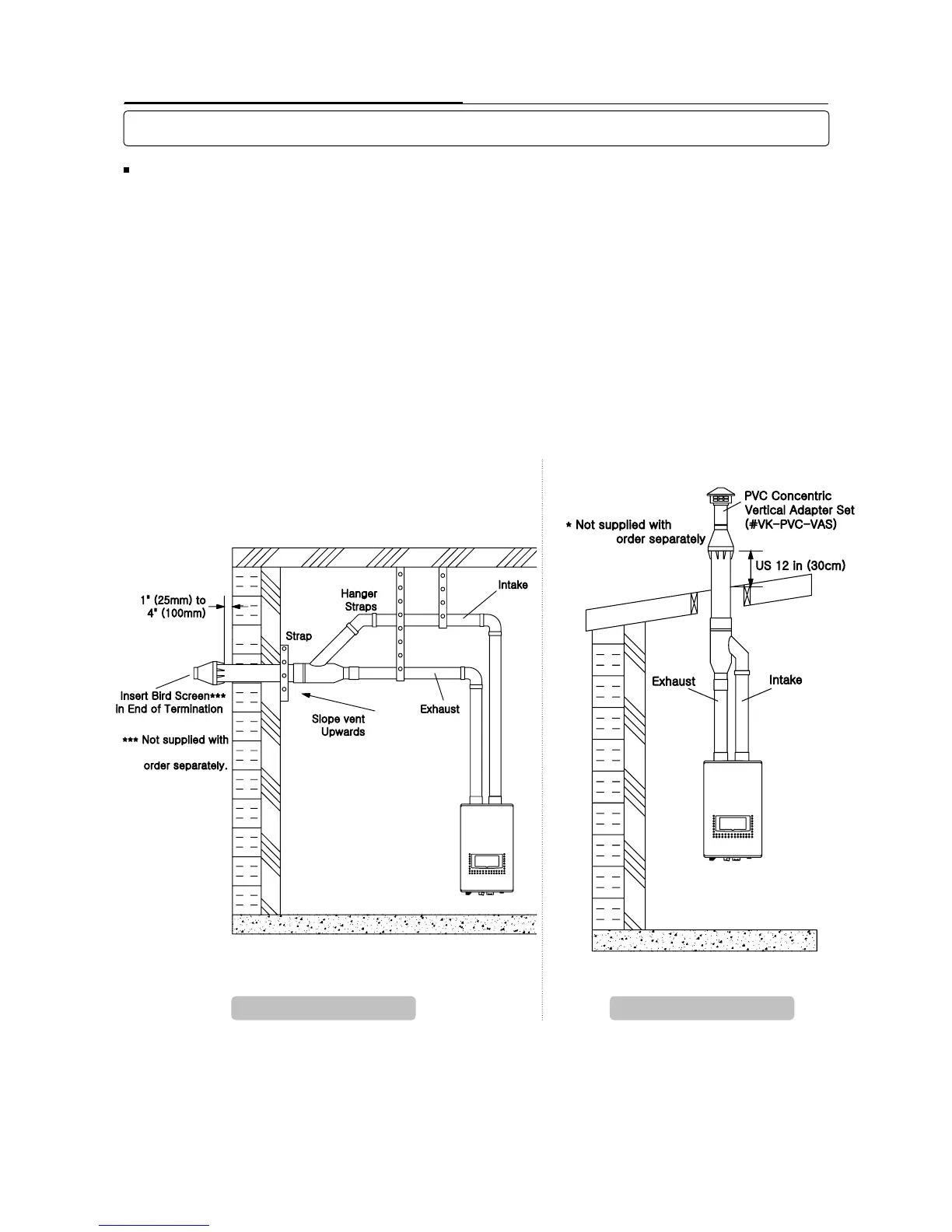 • Slope the horizontal vent 1/4” upwards for every 12" (300mm).