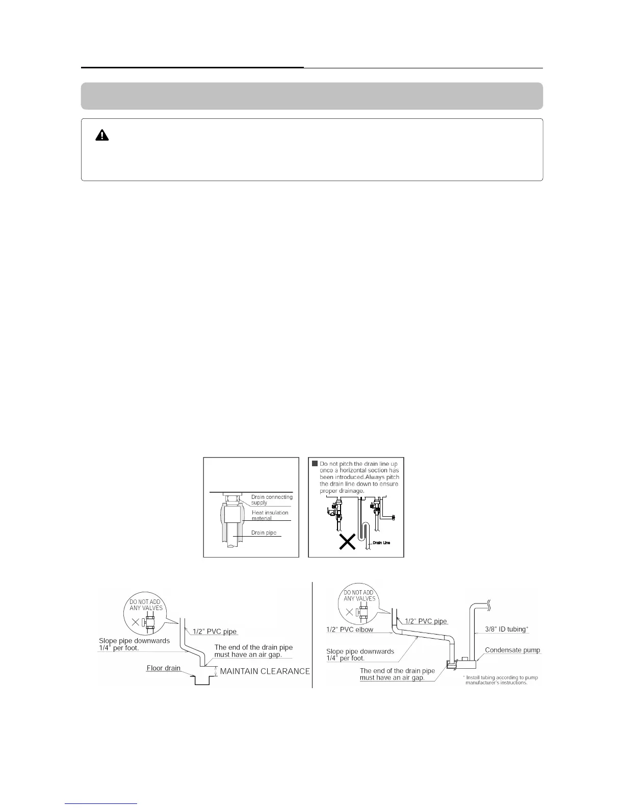 drain pipe, use the appropriate size pipe, allow the proper clearances, and apply freeze prevention measures (when necessary) to