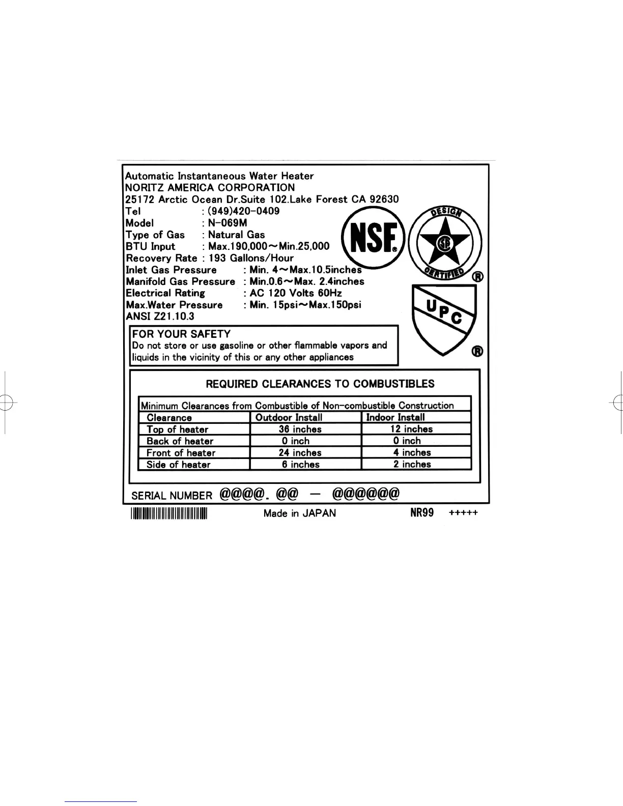 Noritz N-069M - Unit Specifications and Clearances