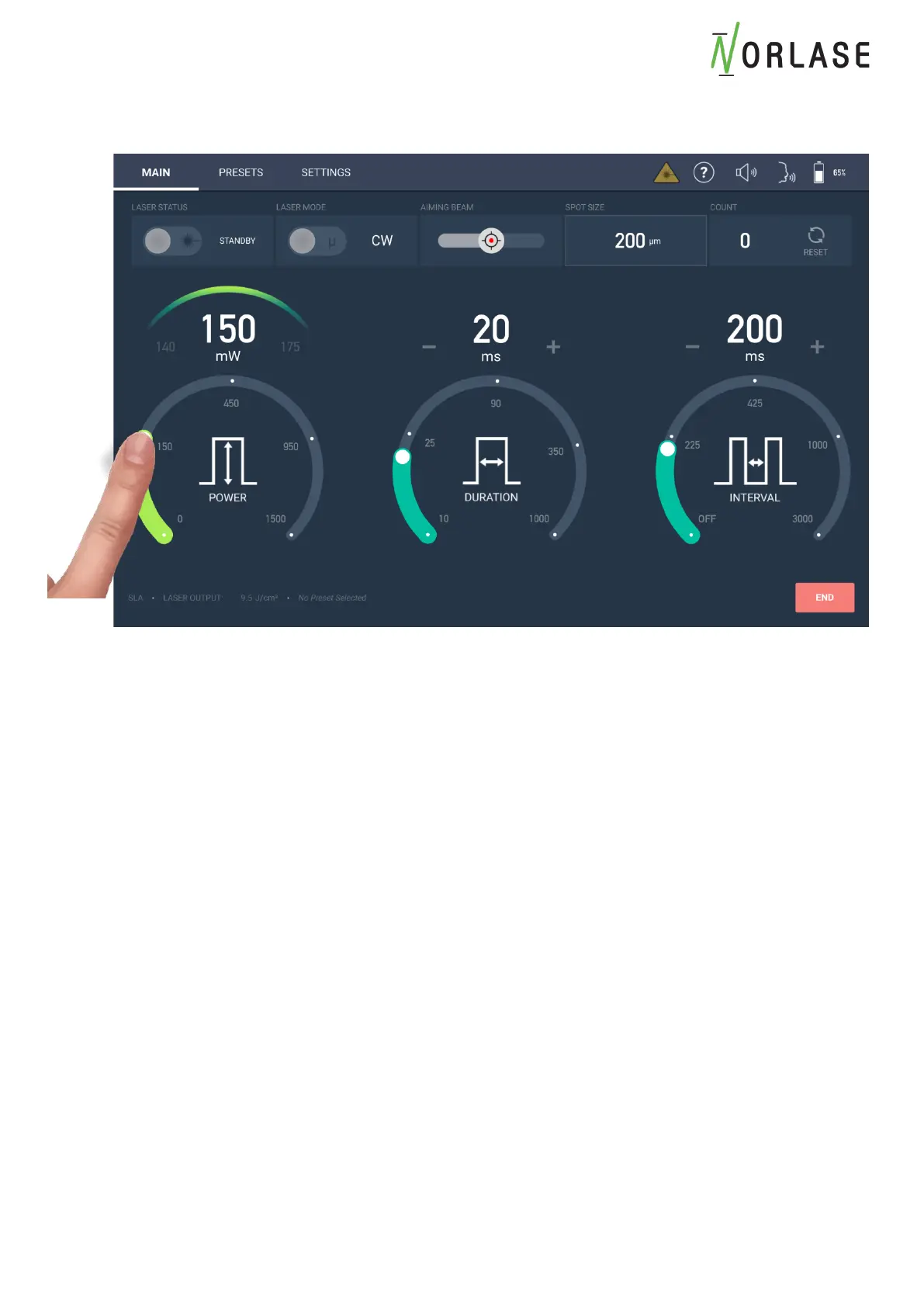 To change any parameter, lightly press your finger along the active area of the arc and slide until