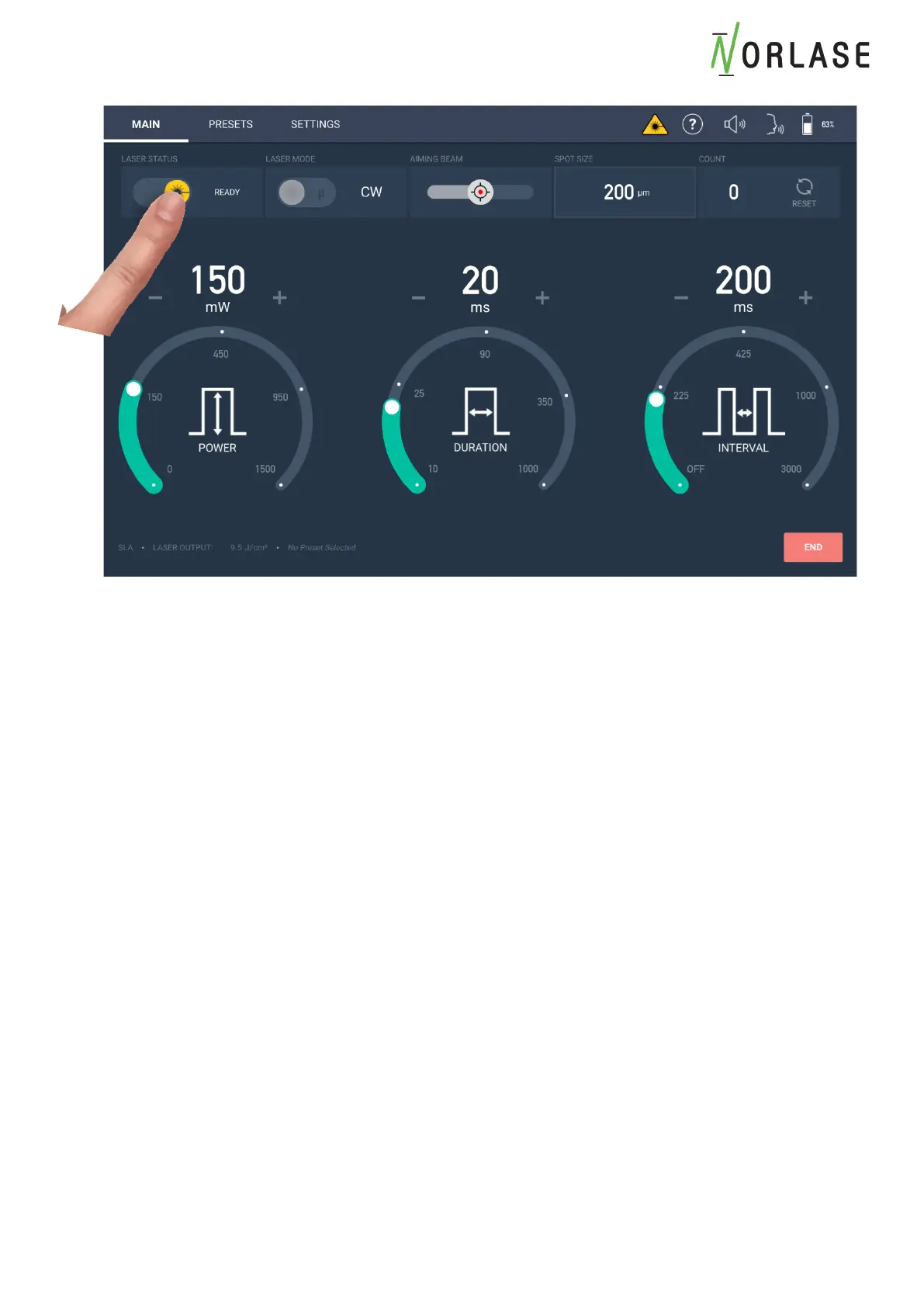Laser status may be selected between Standby and Ready by pressing in the active region. The