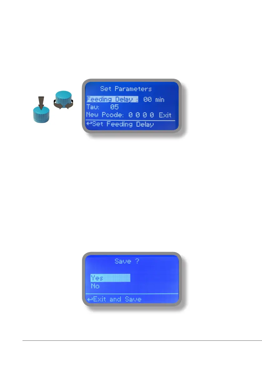 Move on “Feeding Delay” then press wheel. Choose a value between 0 (disabled) and 60 minutes (maximum delay