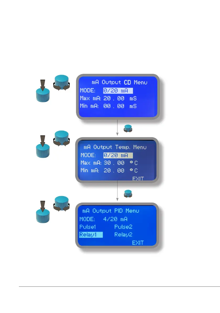 This menu allows to configure mA current otputs for Conductivity, Temperature channels and PID mA mode. Options