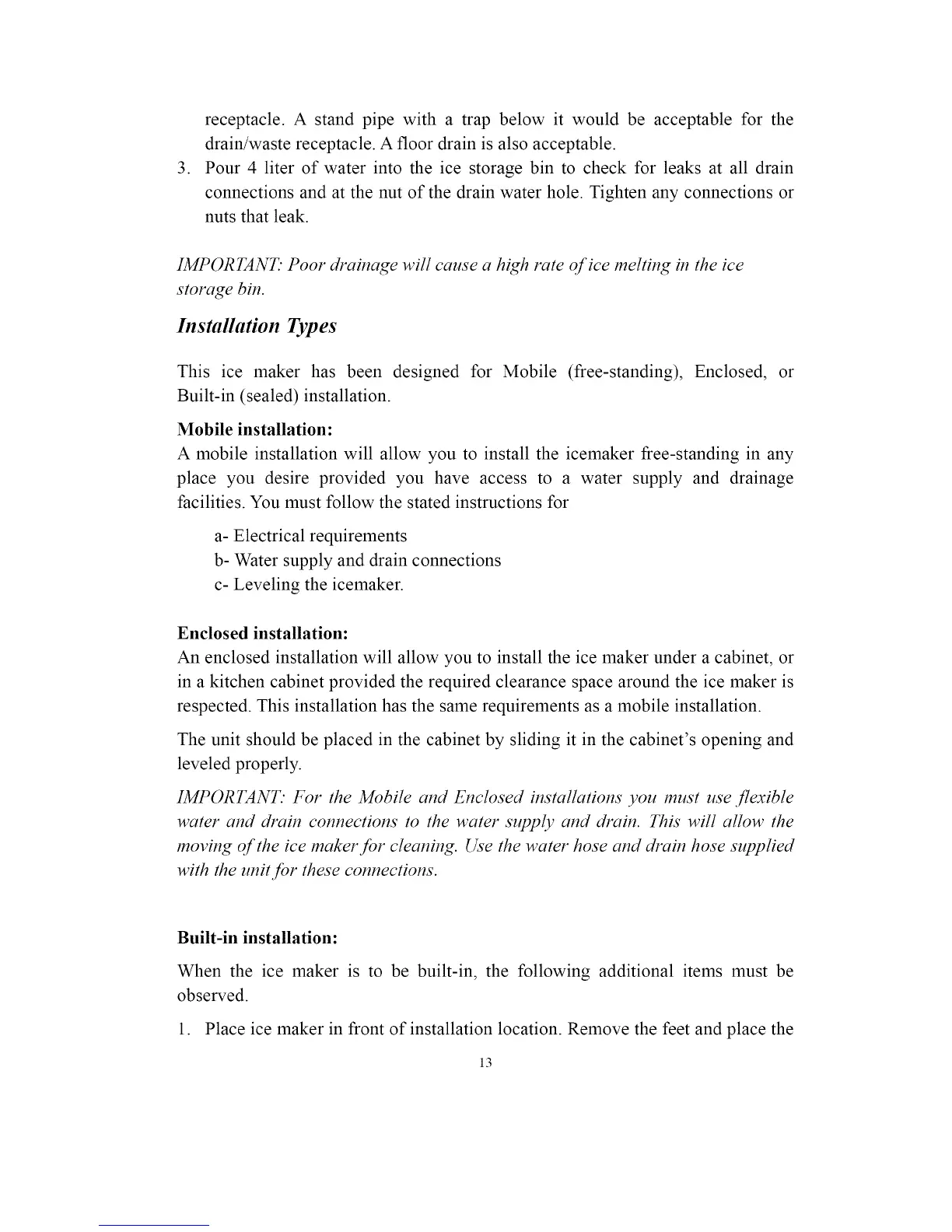 This ice maker has been designed for Mobile (free-standing), Enclosed, or