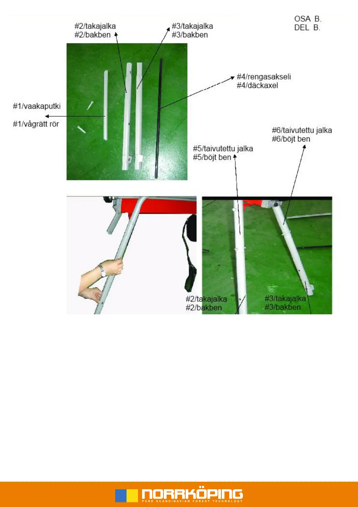 Yhdistä takajalka (2) taivutettuun jalkaan (5), ja takajalka (3) taivutettuun jalkaan (6) pulteilla.