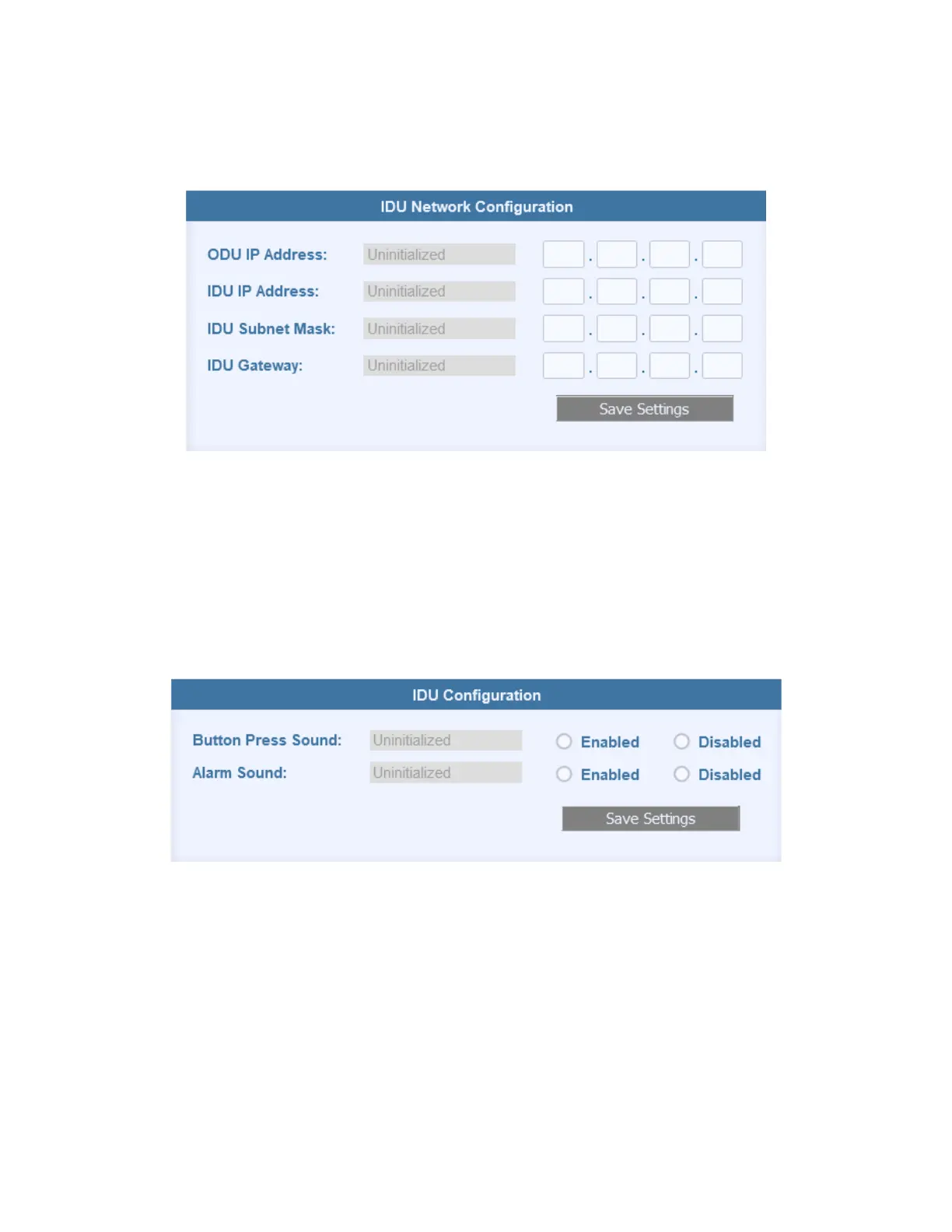 The IDU Network Configuration section displays to the Network Settings for the IDU. The current
