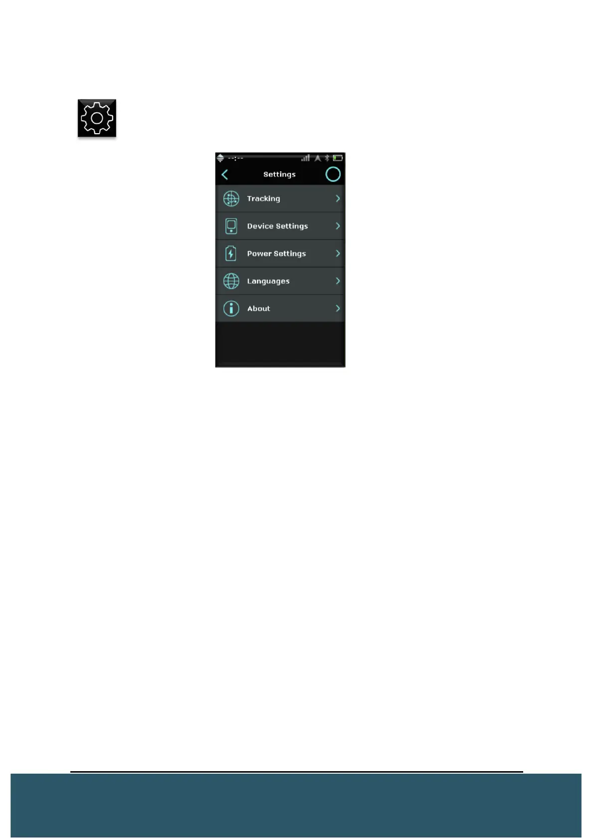 Tracking, Device Settings, Power Settings, Language and About.