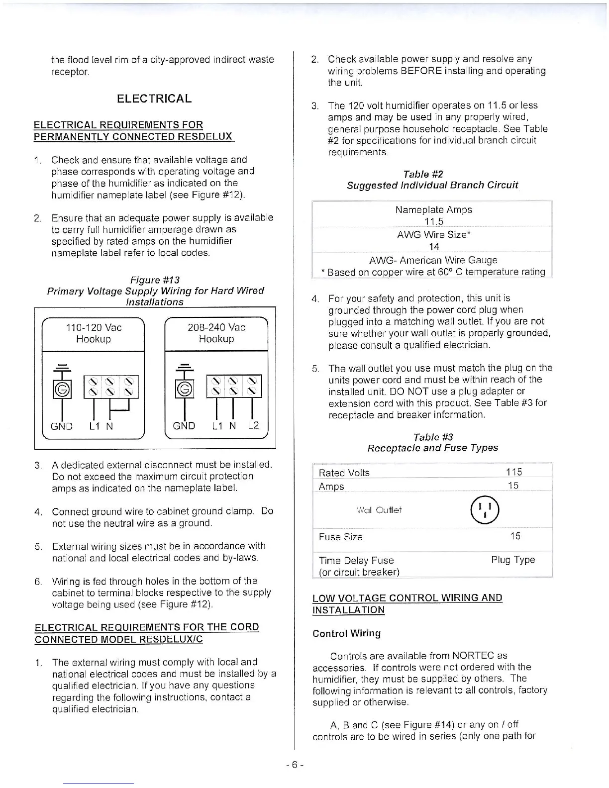 Nortec RESDELUX - Electrical; Electrical Requirements for Permanently Connected Resdelux; Electrical Requirements for the Cord Connected Model Resdelux;C; Low Voltage Control Wiring and Installation