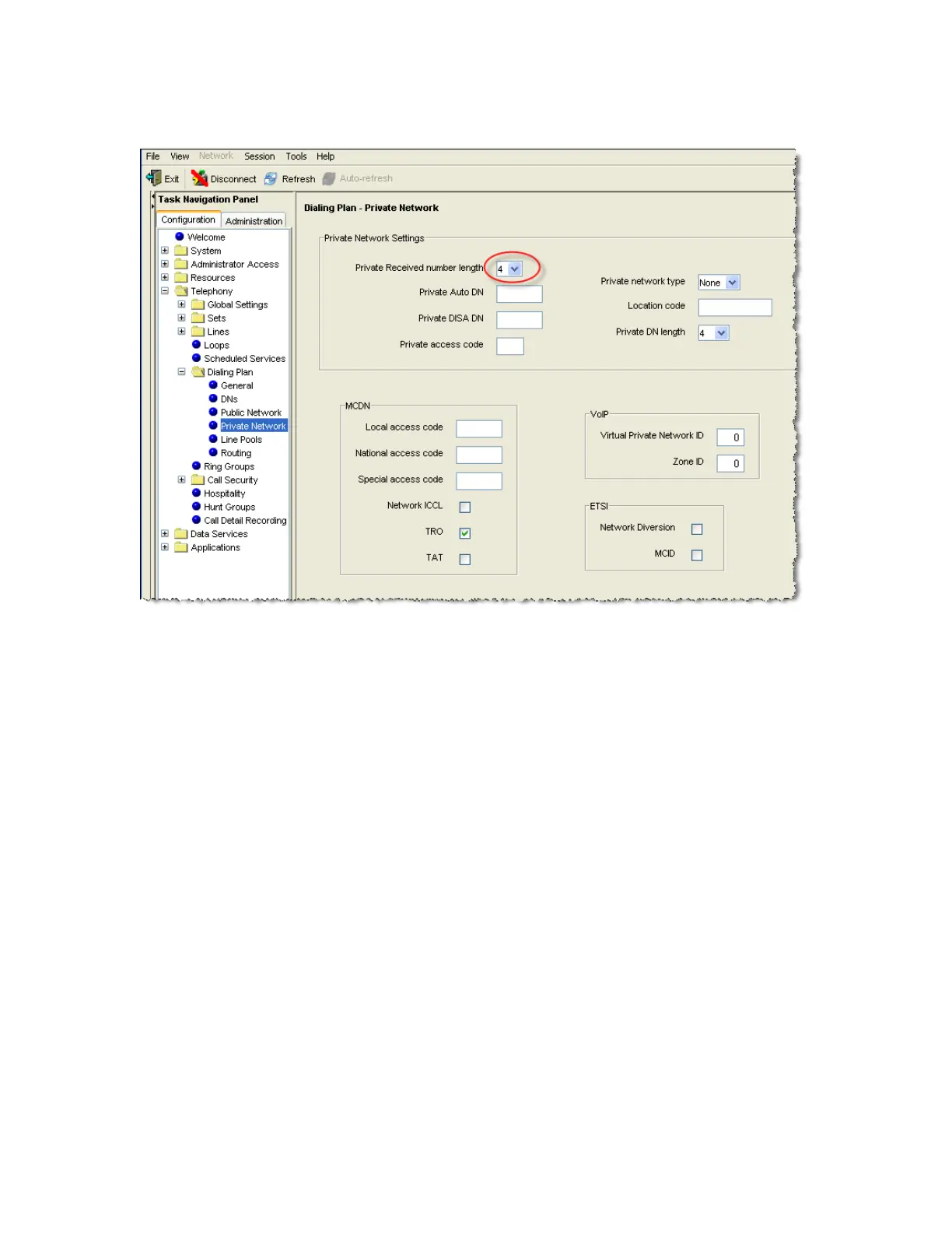 Figure 9: Configuring Private Received Number Length