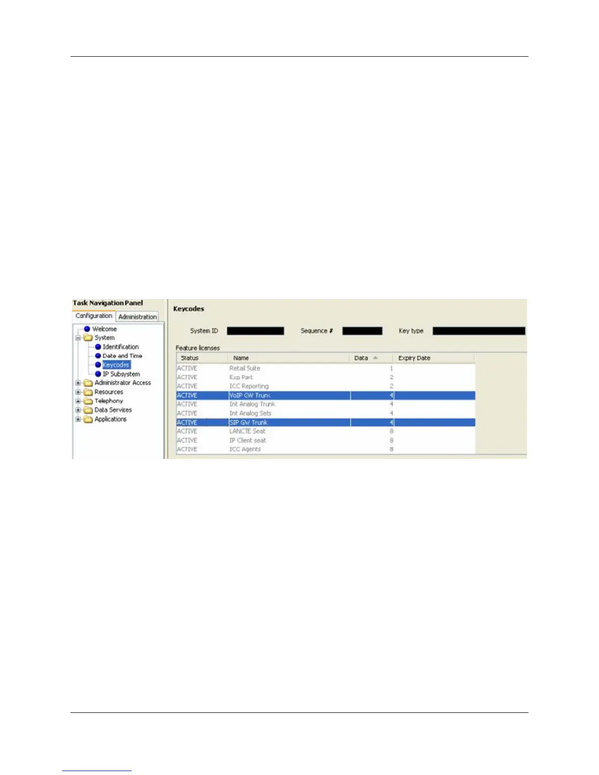 3 Verify that the appropriate keycode is active. For H323 trunks, the keycode is VoIP GW