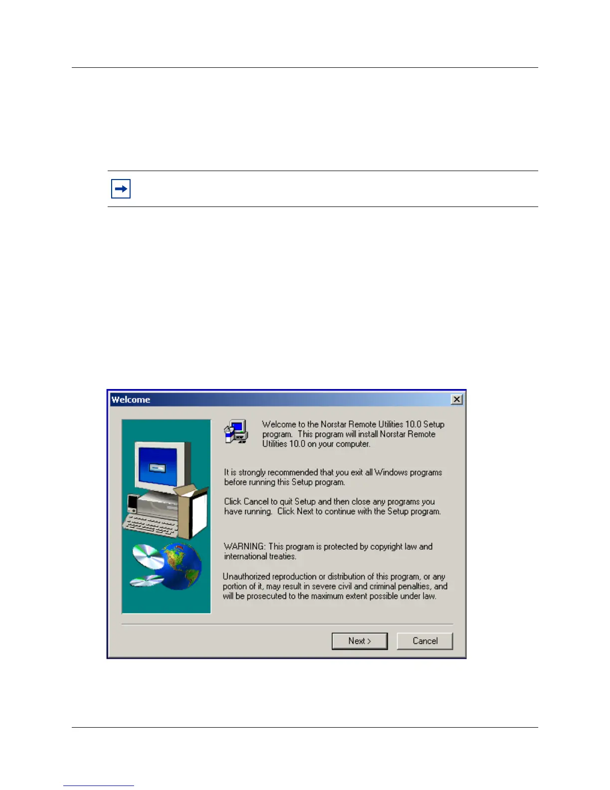 installation starts. The first screen you see is the welcome screen, shown in