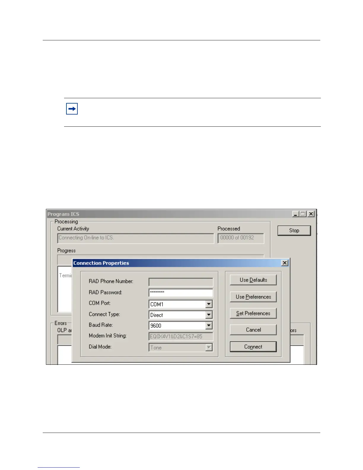 The Program ICS screen appears, then the Connection Properties screen appears on top.