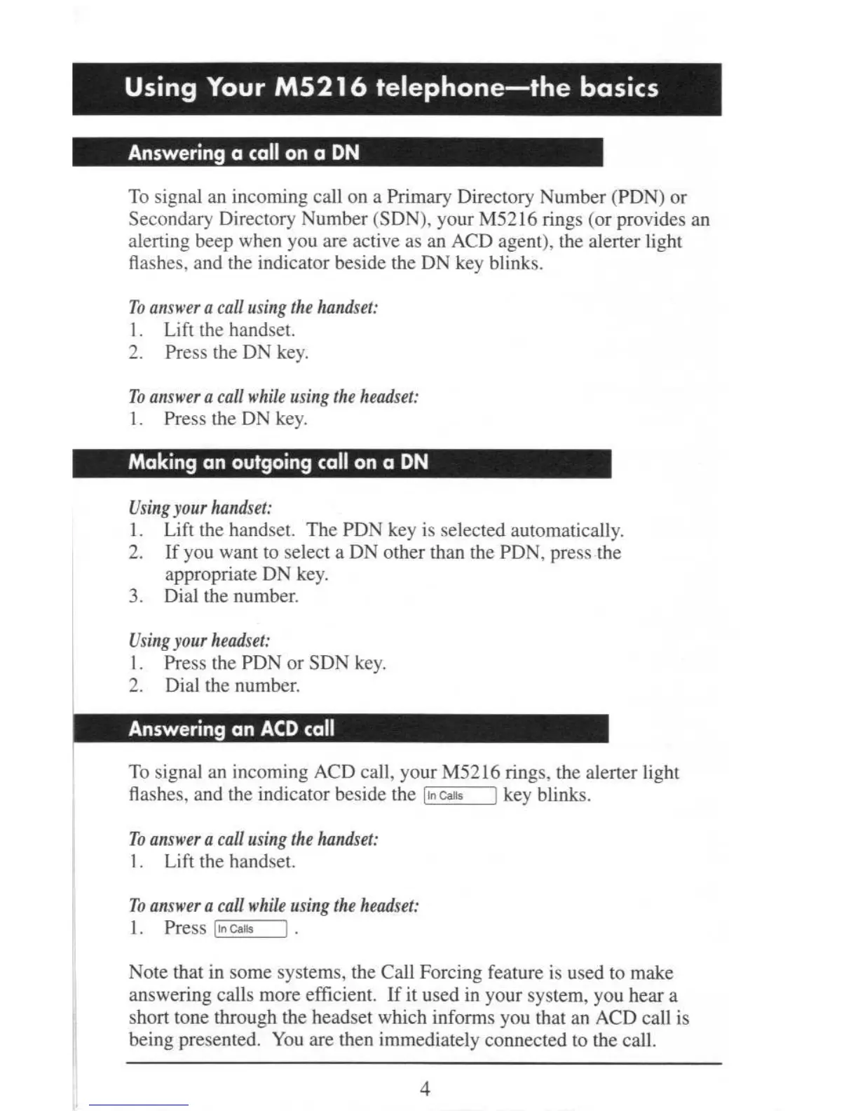 Nortel M5216 - Answering a Call on a DN; Making an Outgoing Call on a DN; Answering an ACD Call; Using Your Handset