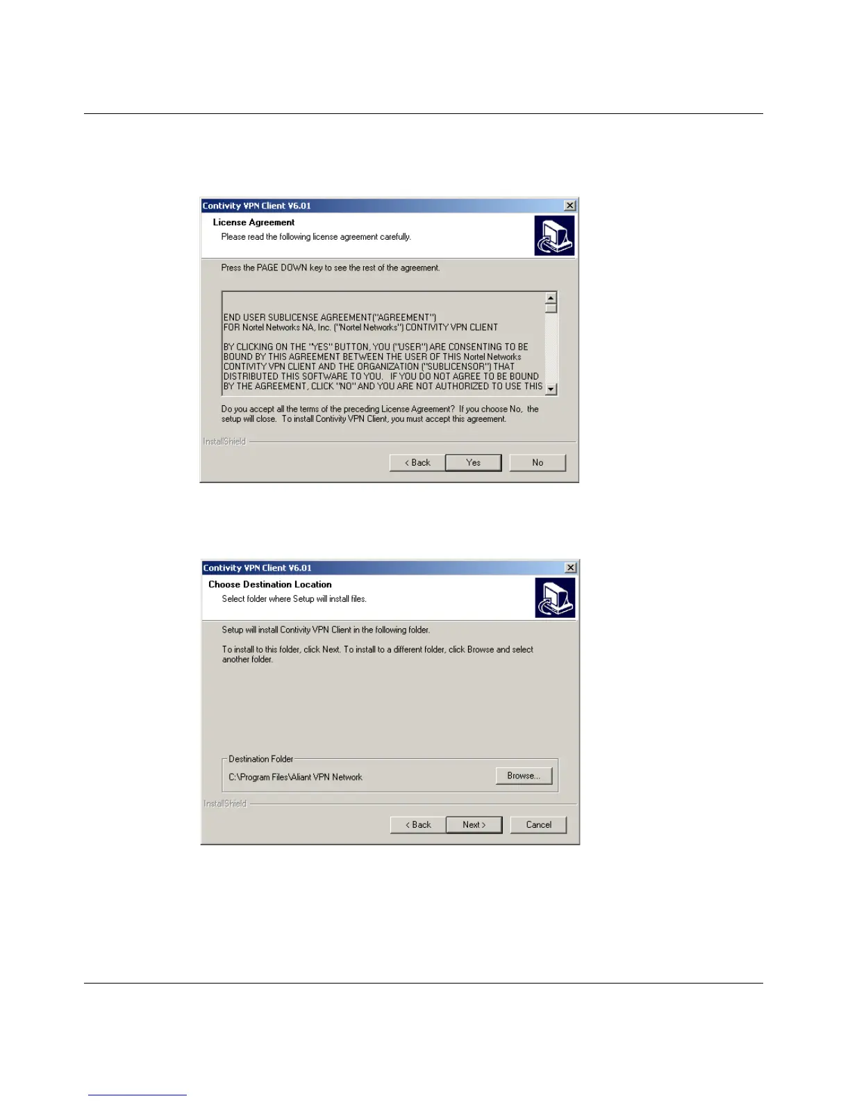 Nortel VPN Client - Figure 2 License Agreement Screen; Figure 3 Destination Screen