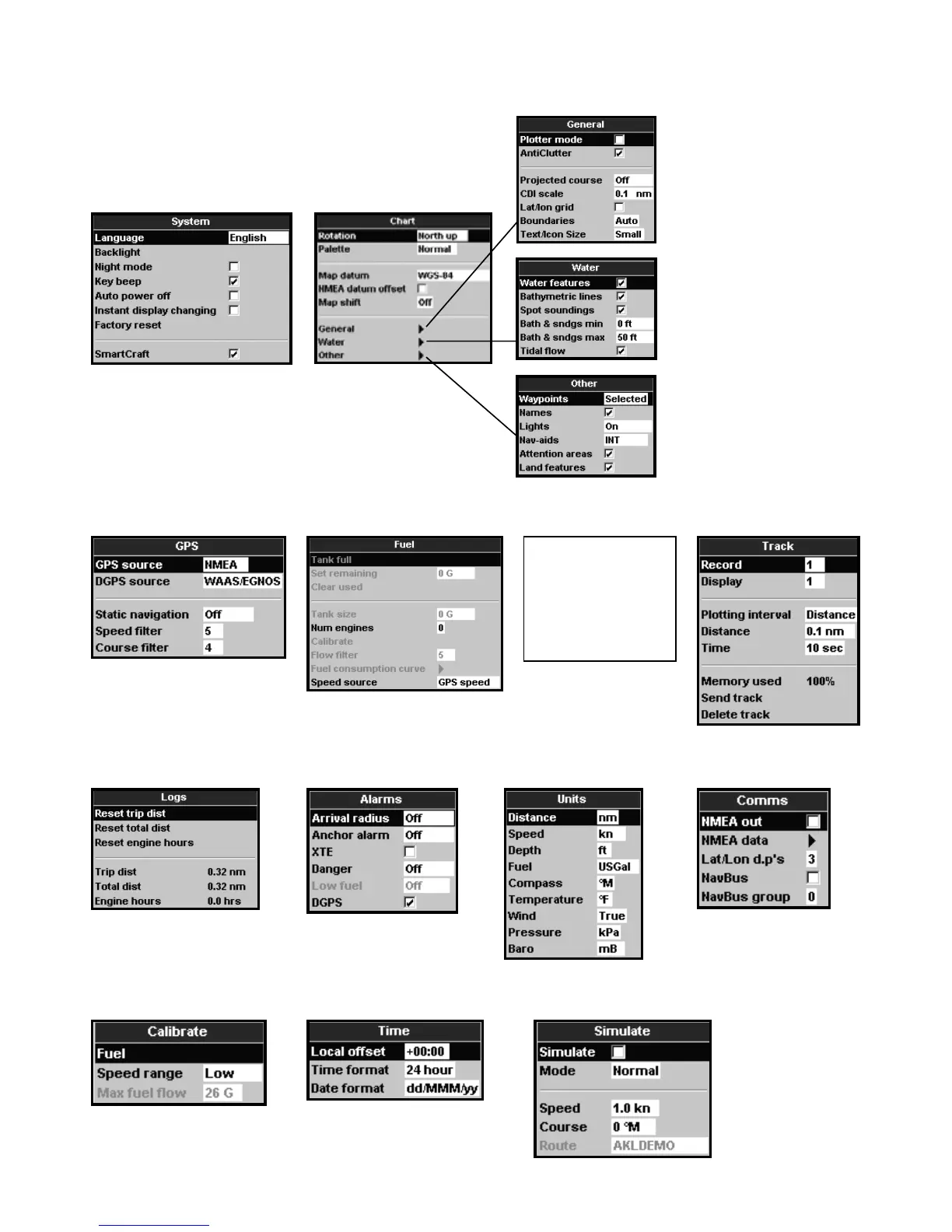 Factory default settings are shown. The setup data available will depend on the optional sensors and