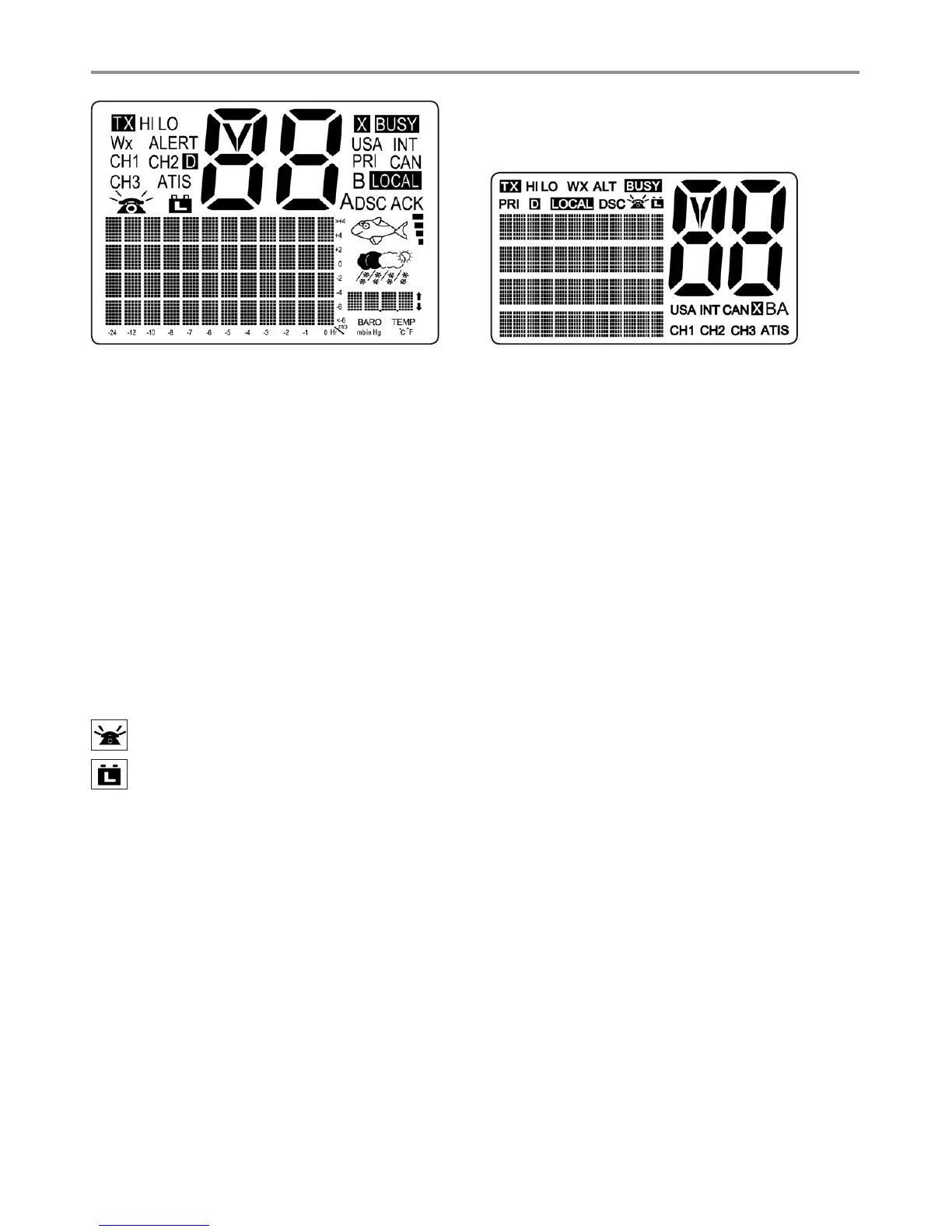 WX ALT Weather Alert. Alarm beeps will sound. 721/725 US only.