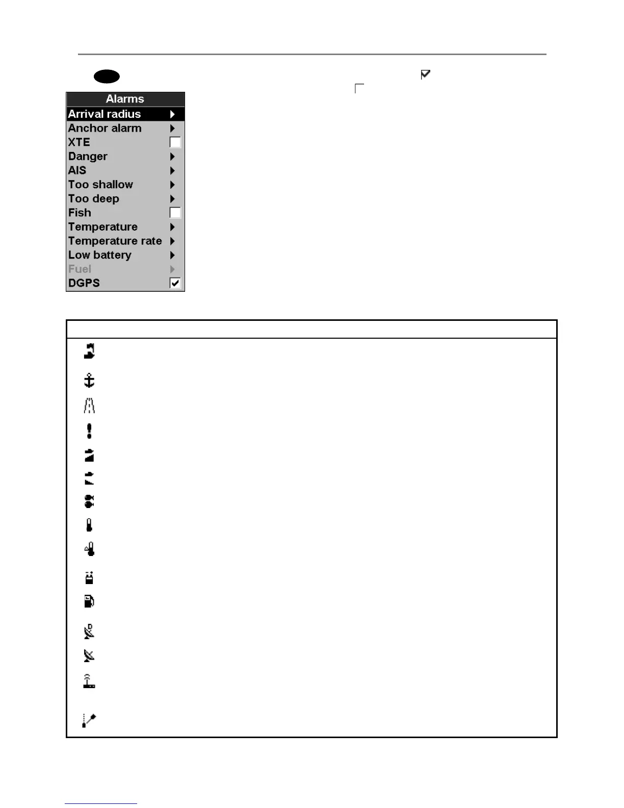 Loss of GPS fi x Instrument can not receive the GPS signal (this alarm is always on)