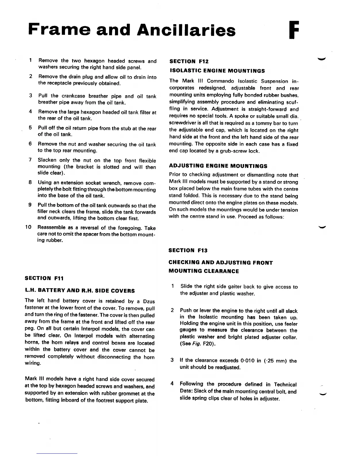 Norton Triumph 850 Commando - SECTION F11 L.H. BATTERY AND R.H. SIDE COVERS; SECTION F12 ISOLASTIC ENGINE MOUNTINGS; SECTION F13 CHECKING AND ADJUSTING FRONT MOUNTING CLEARANCE