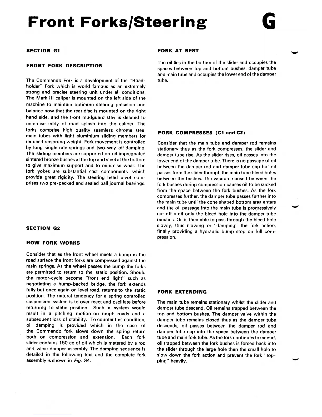 Norton Triumph 850 Commando - SECTION G1 FRONT FORK DESCRIPTION; SECTION G2 HOW FORK WORKS