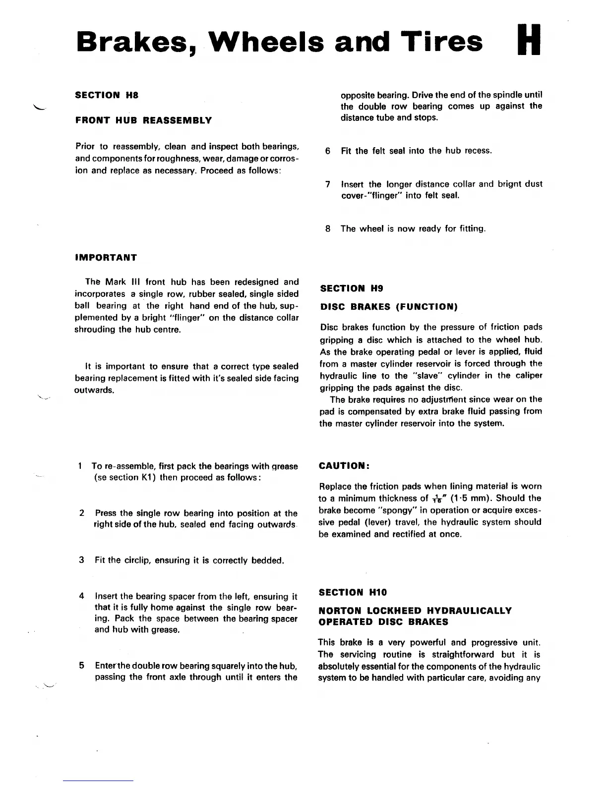 Norton Triumph 850 Commando - SECTION H8 FRONT HUB REASSEMBLY; SECTION H9 DISC BRAKES (FUNCTION); SECTION H10 NORTON LOCKHEED HYDRAULICALLY OPERATED DISC BRAKES