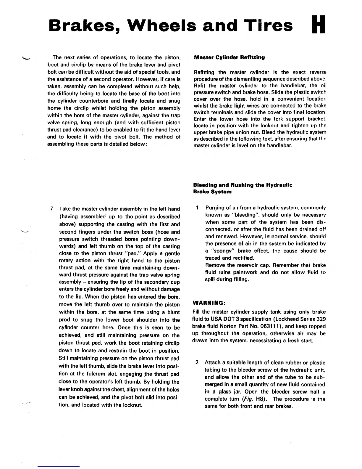 Norton Triumph 850 Commando - SECTION H13 BRAKE FLUID SYSTEM; SECTION H18 BLEEDING AND FLUSHING THE HYDRAULIC BRAKE SYSTEM
