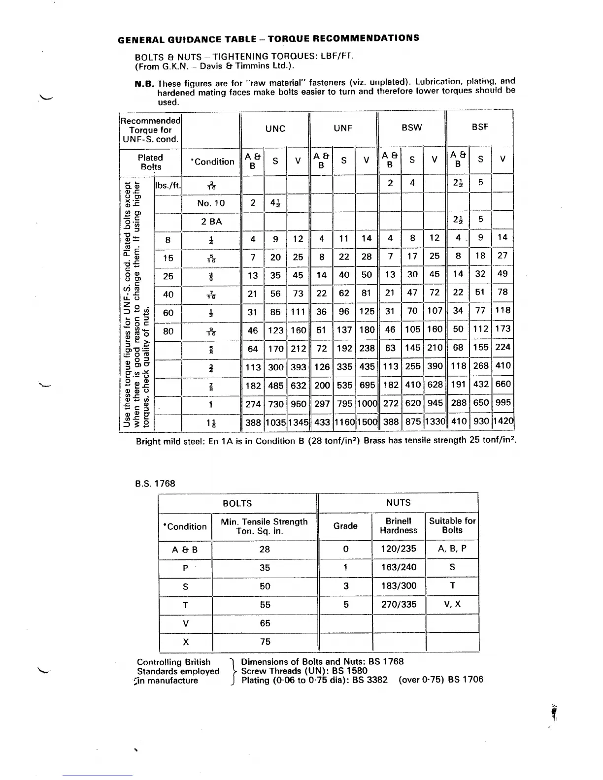 Norton Triumph 850 Commando - GENERAL GUIDANCE TABLE - TORQUE RECOMMENDATIONS; BOLTS; NUTS