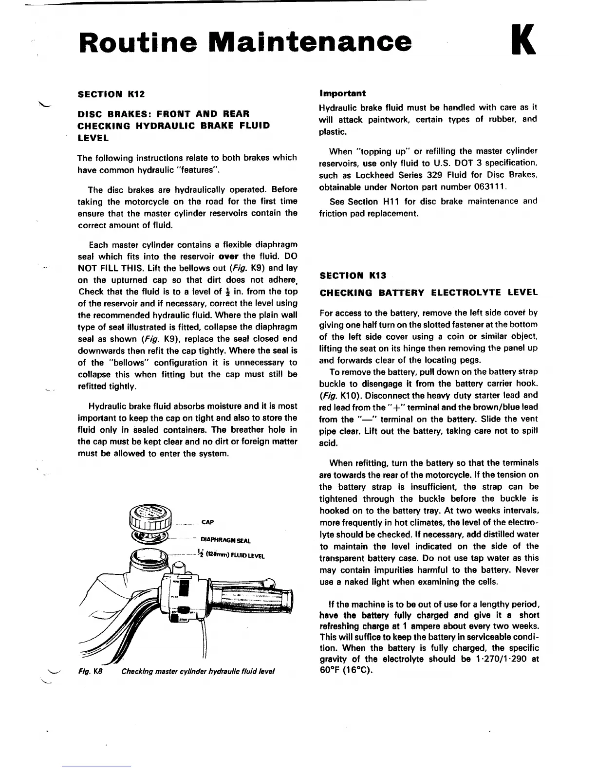 Norton Triumph 850 Commando - SECTION K12 DISC BRAKES: FRONT AND REAR CHECKING HYDRAULIC BRAKE FLUID LEVEL; SECTION K13 CHECKING BATTERY ELECTROLYTE LEVEL