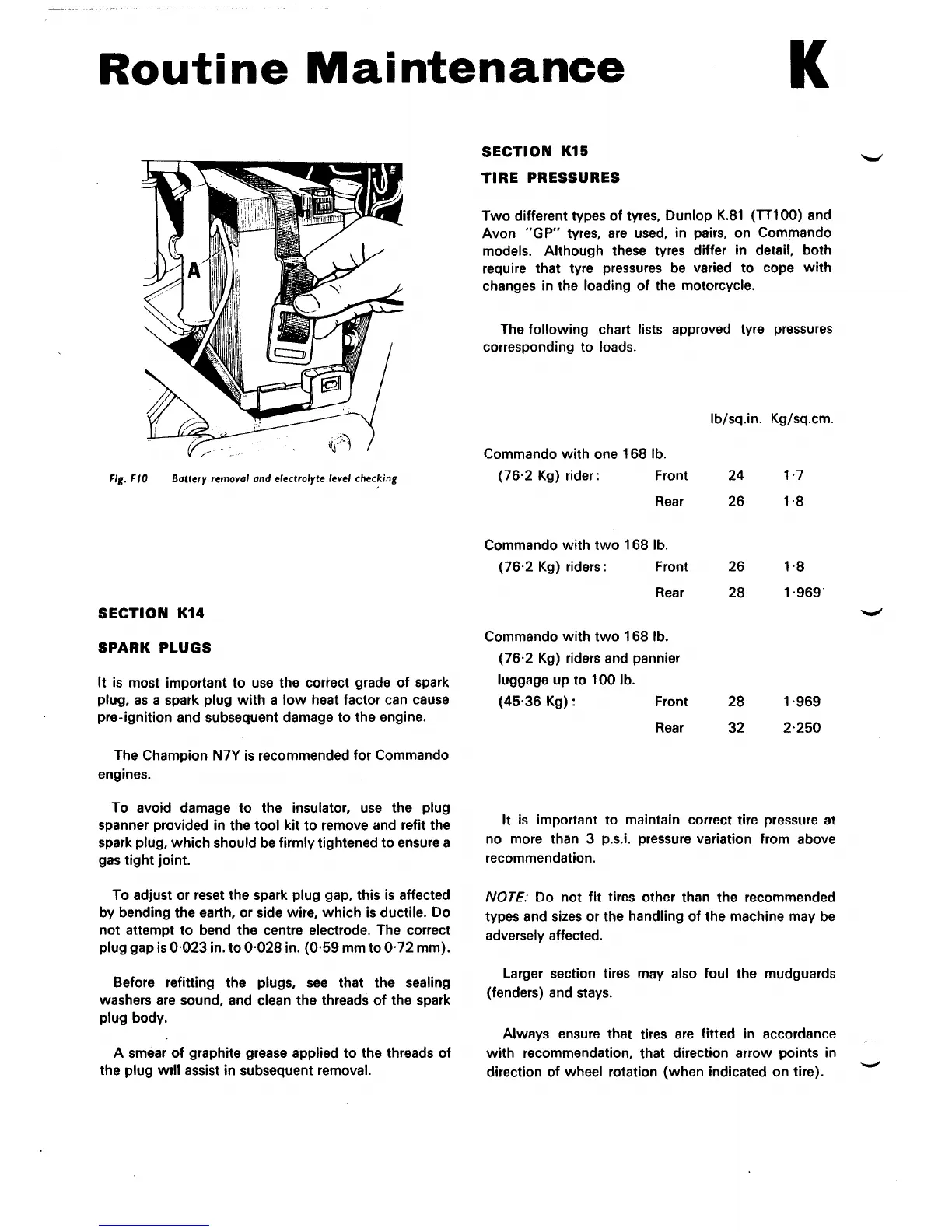 Norton Triumph 850 Commando - SECTION K14 SPARK PLUGS; SECTION K15 TIRE PRESSURES