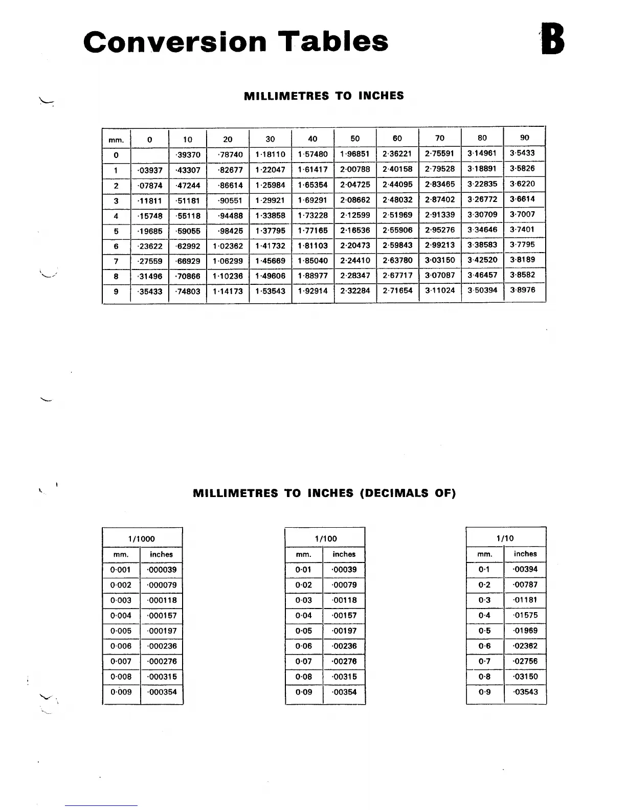 Norton Triumph 850 Commando - CONVERSION TABLES; MILLIMETRES TO INCHES