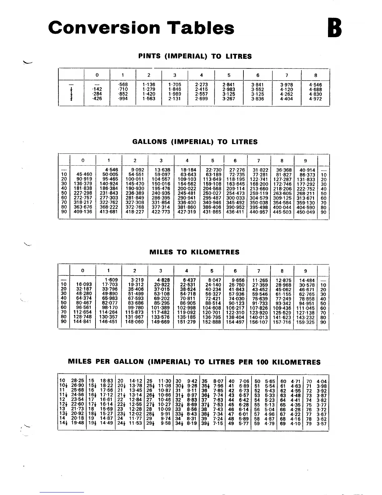 Norton Triumph 850 Commando - CONVERSION TABLES (Volume and Economy); Pints to Litres; Miles per Gallon to Kilometres
