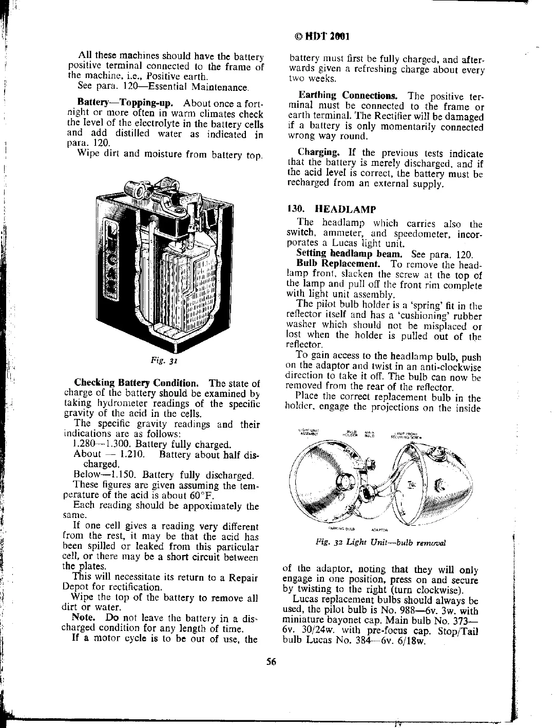 Norton 50 - Headlamp; Bulb Replacement; Battery Topping up; Checking Battery Condition